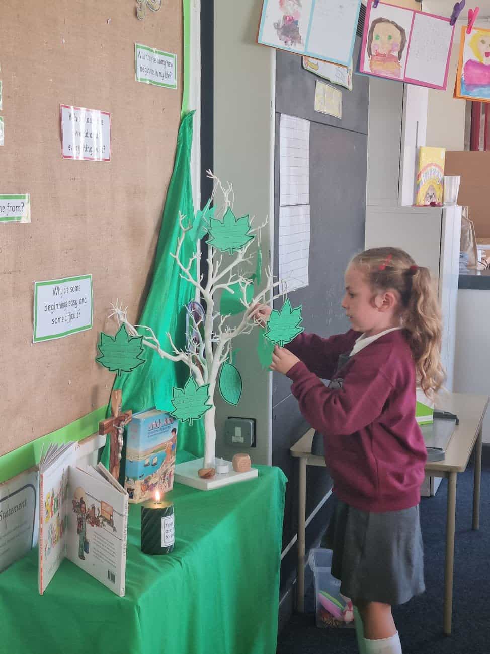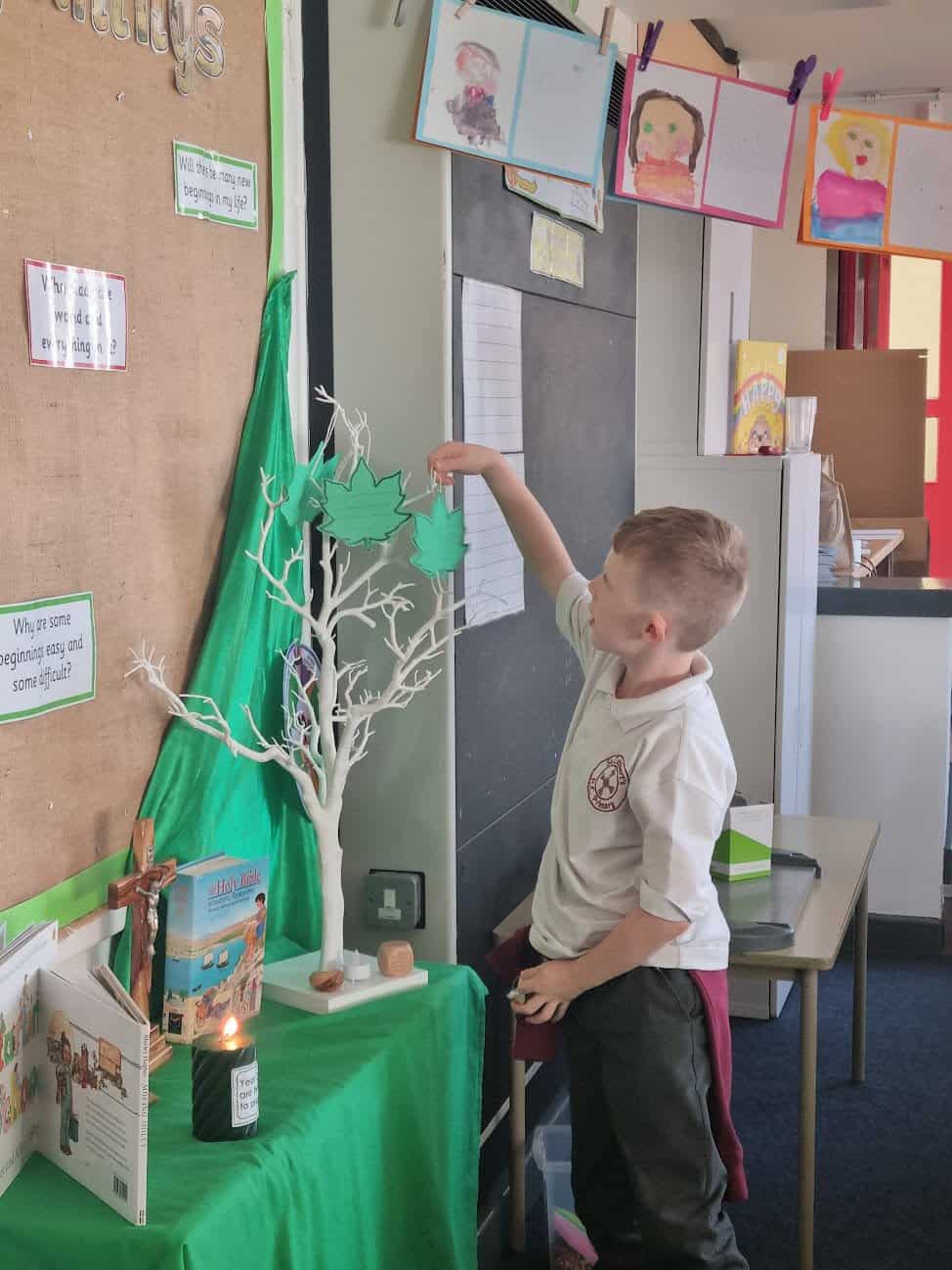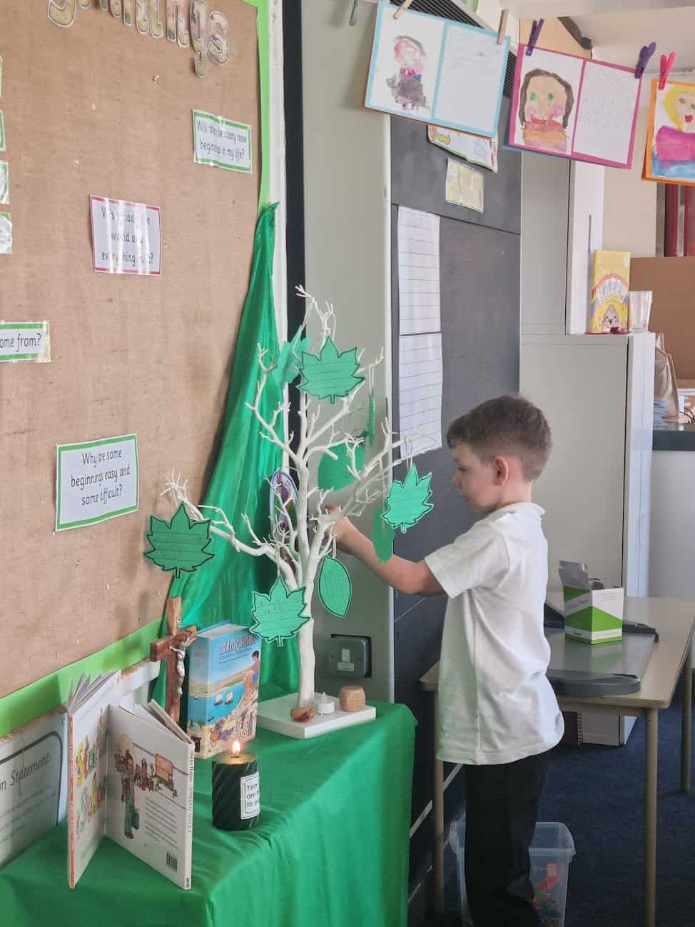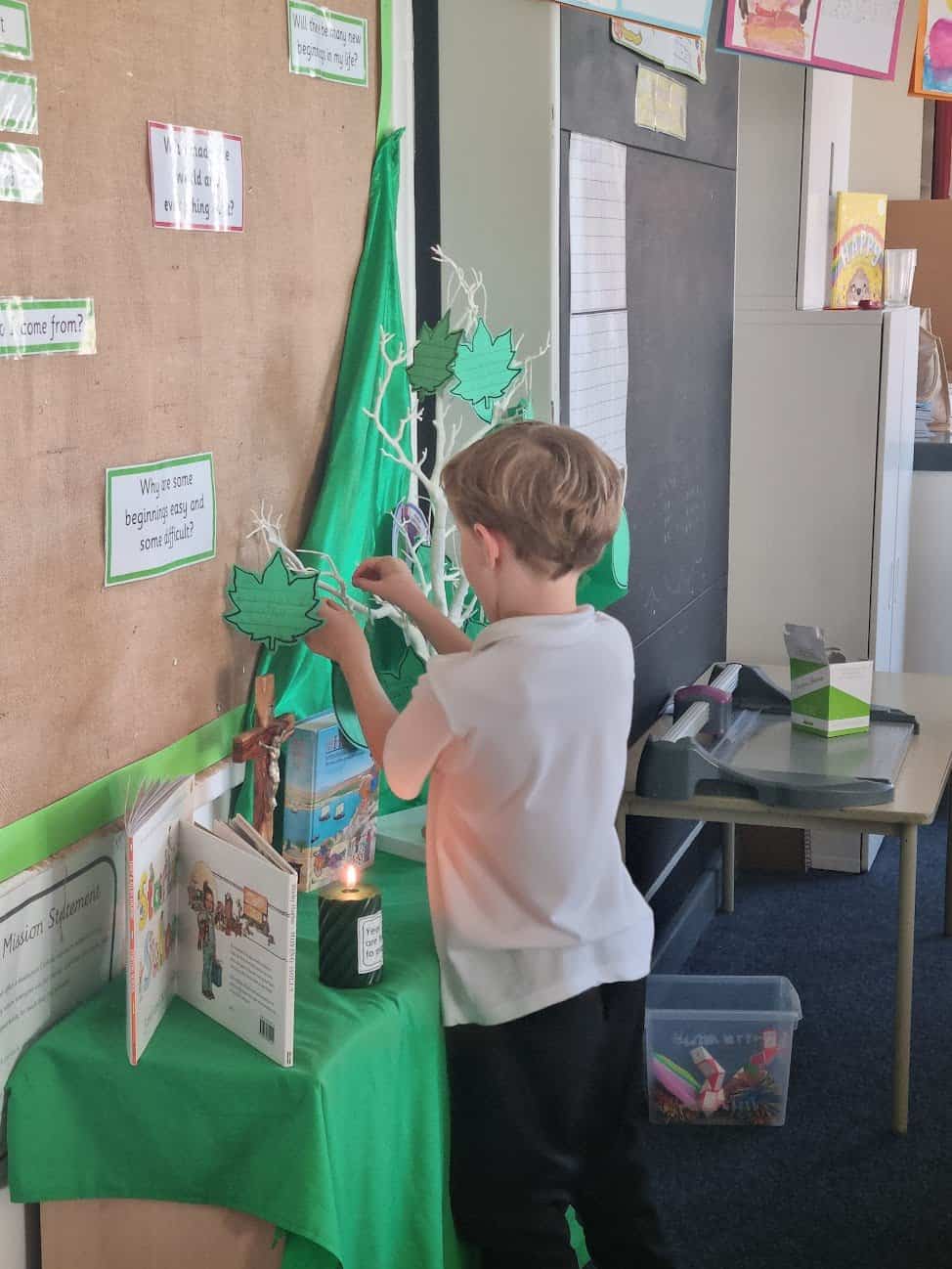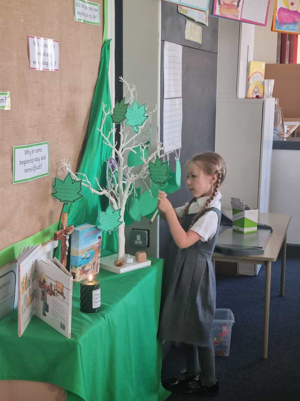 We then wrote on a leaf describing a new beginning. We gathered around our class display and had a quiet moment together reflecting on and appreciating how every beginning is an opportunity for a new start. We also thought about the many beginnings each new day offers.