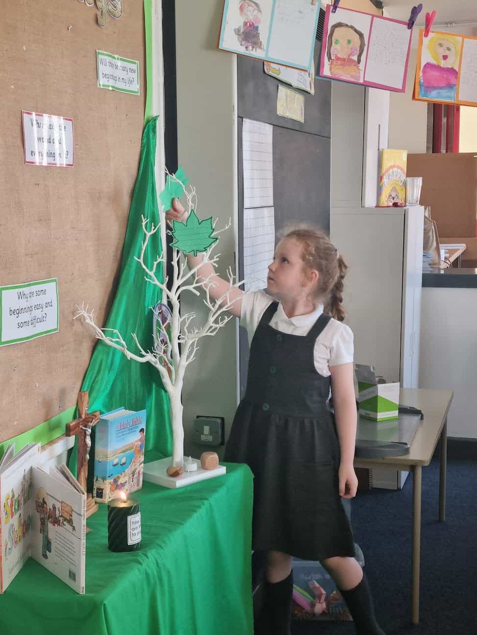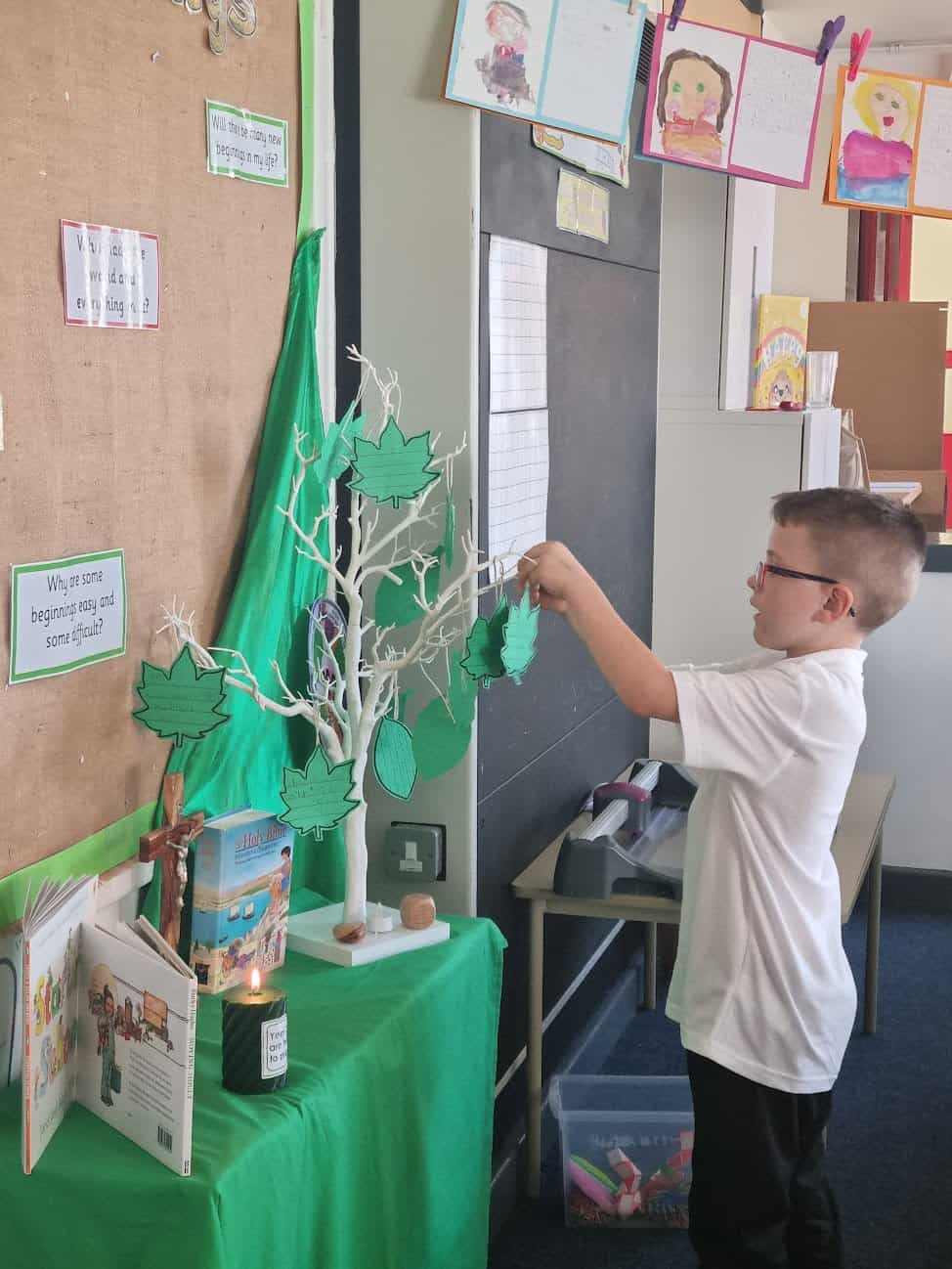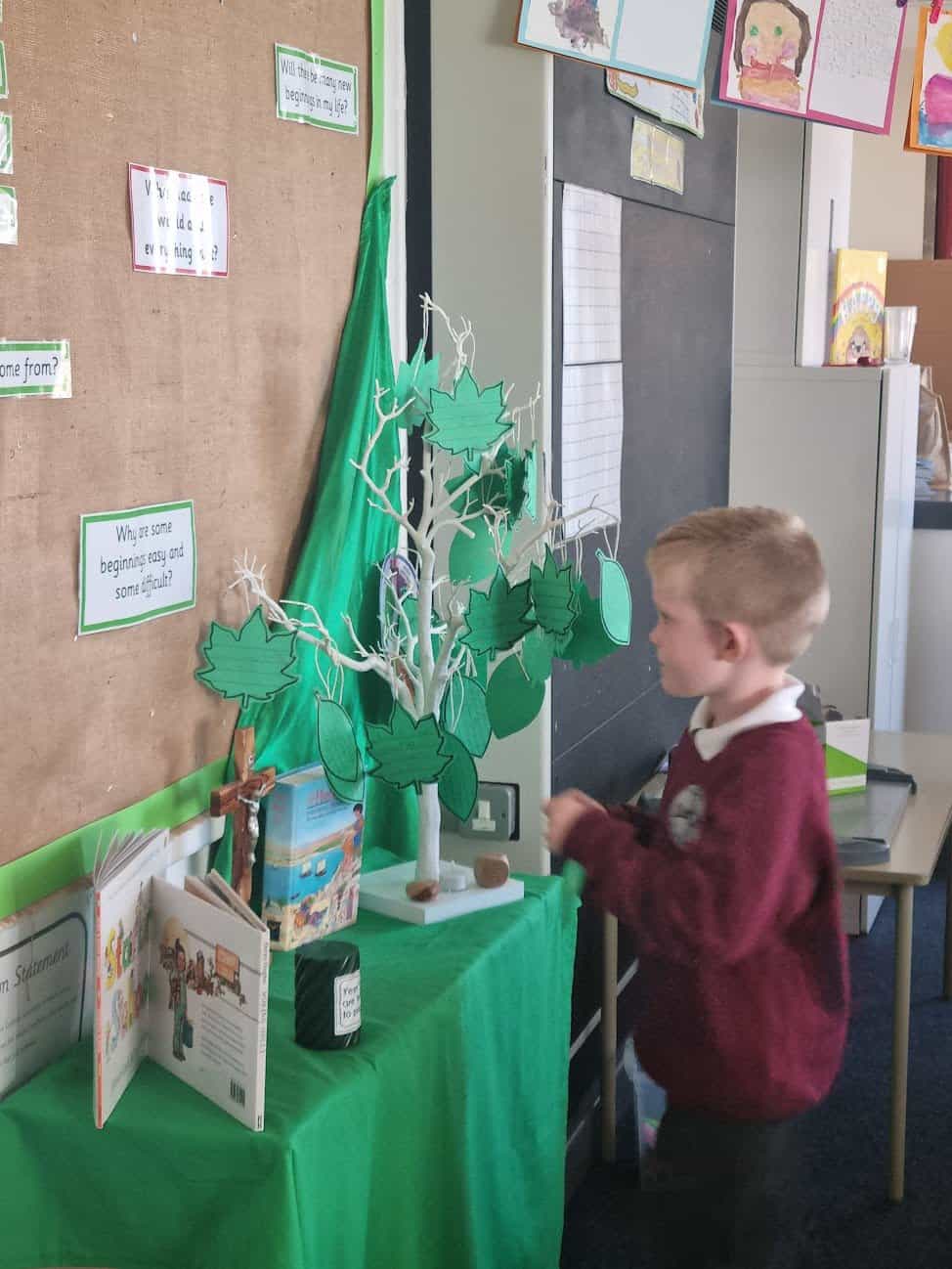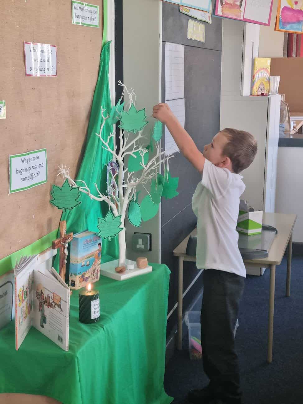 We then wrote on a leaf describing a new beginning. We gathered around our class display and had a quiet moment together reflecting on and appreciating how every beginning is an opportunity for a new start. We also thought about the many beginnings each new day offers.