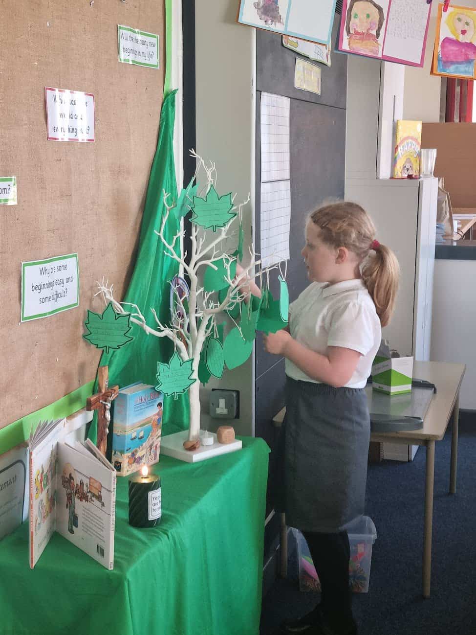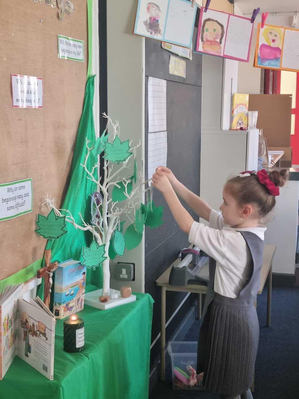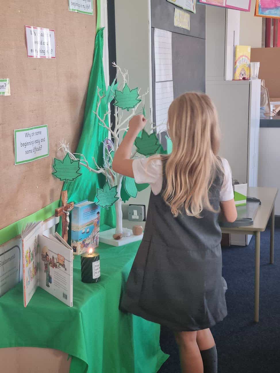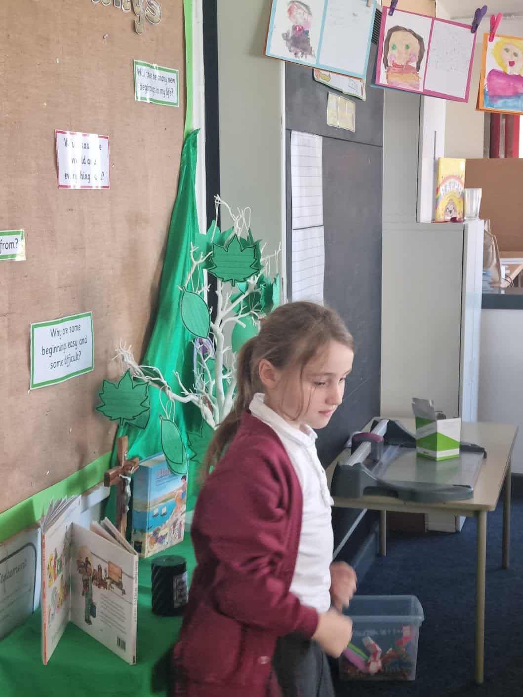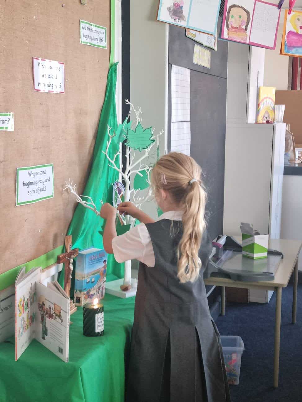 We then wrote on a leaf describing a new beginning. We gathered around our class display and had a quiet moment together reflecting on and appreciating how every beginning is an opportunity for a new start. We also thought about the many beginnings each new day offers.