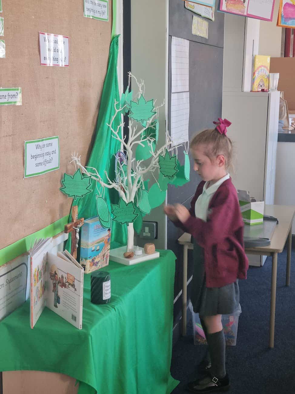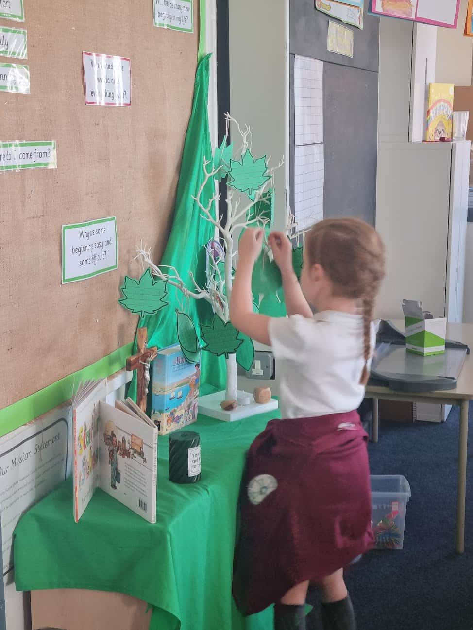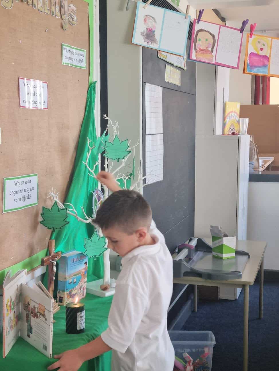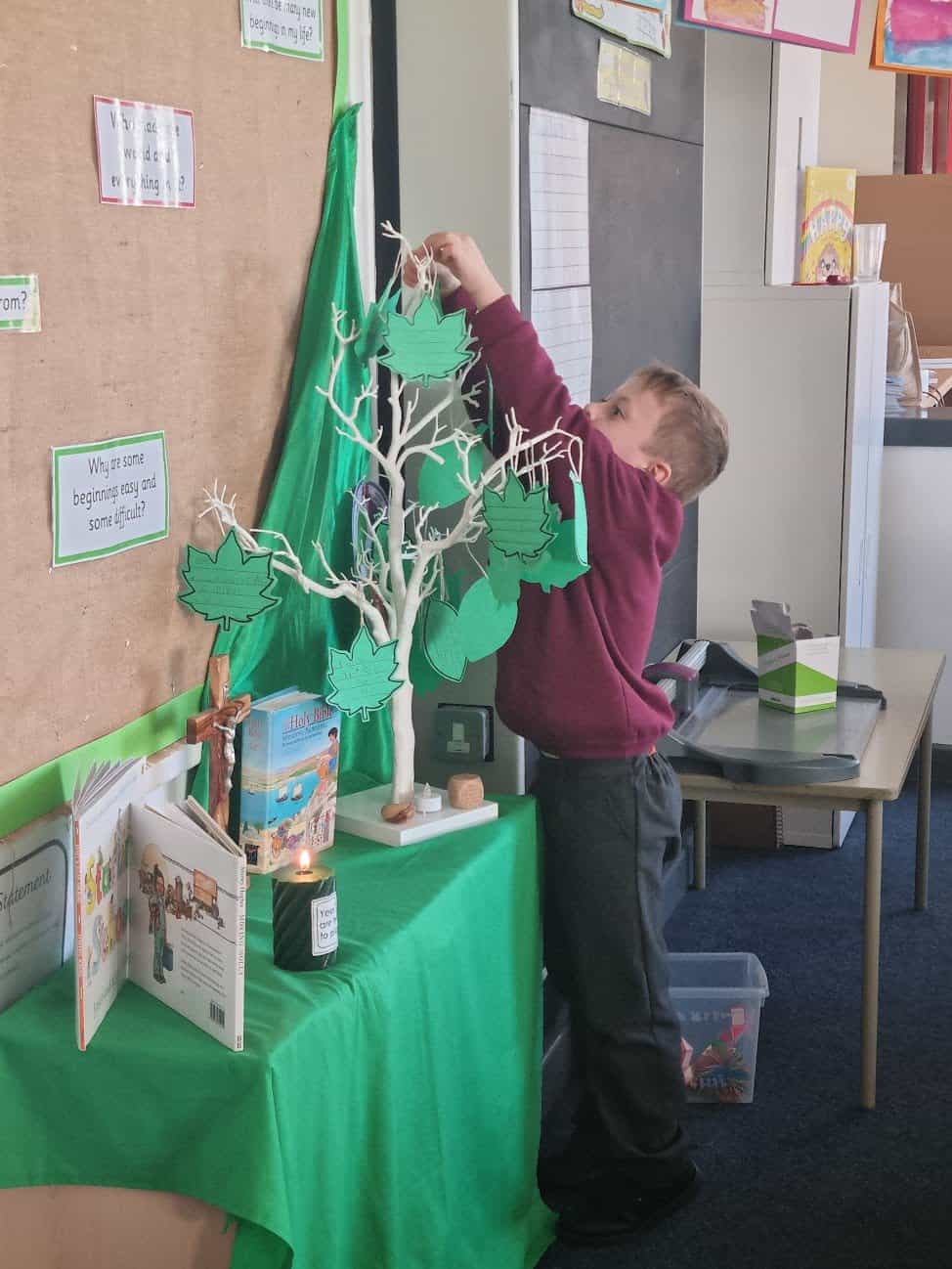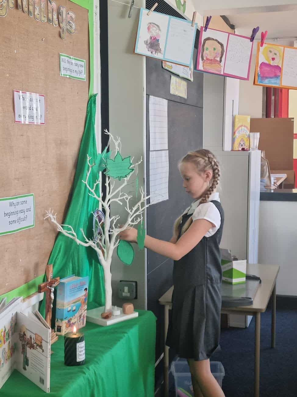 We then wrote on a leaf describing a new beginning. We gathered around our class display and had a quiet moment together reflecting on and appreciating how every beginning is an opportunity for a new start. We also thought about the many beginnings each new day offers.