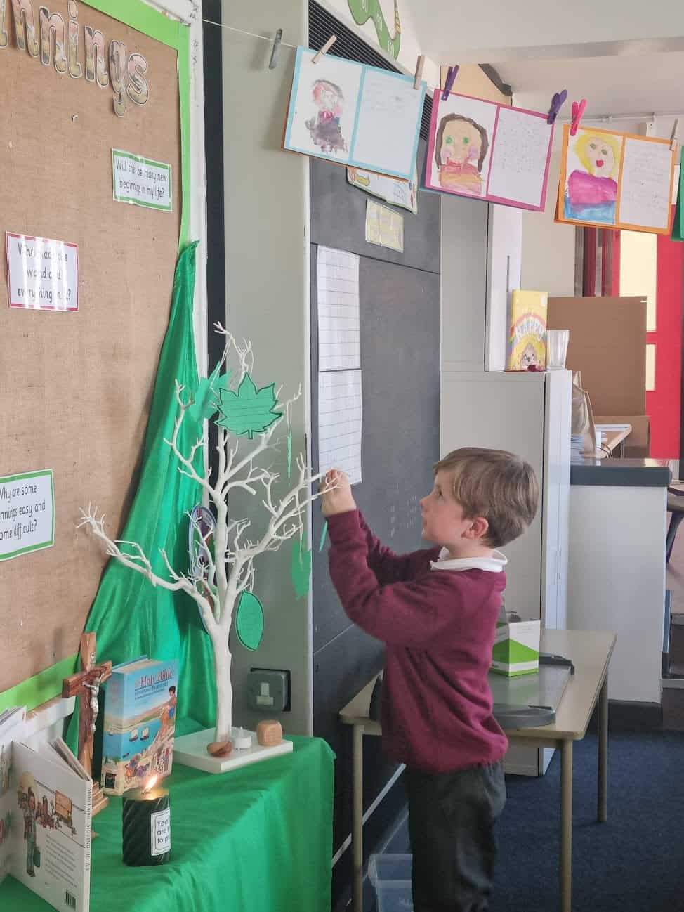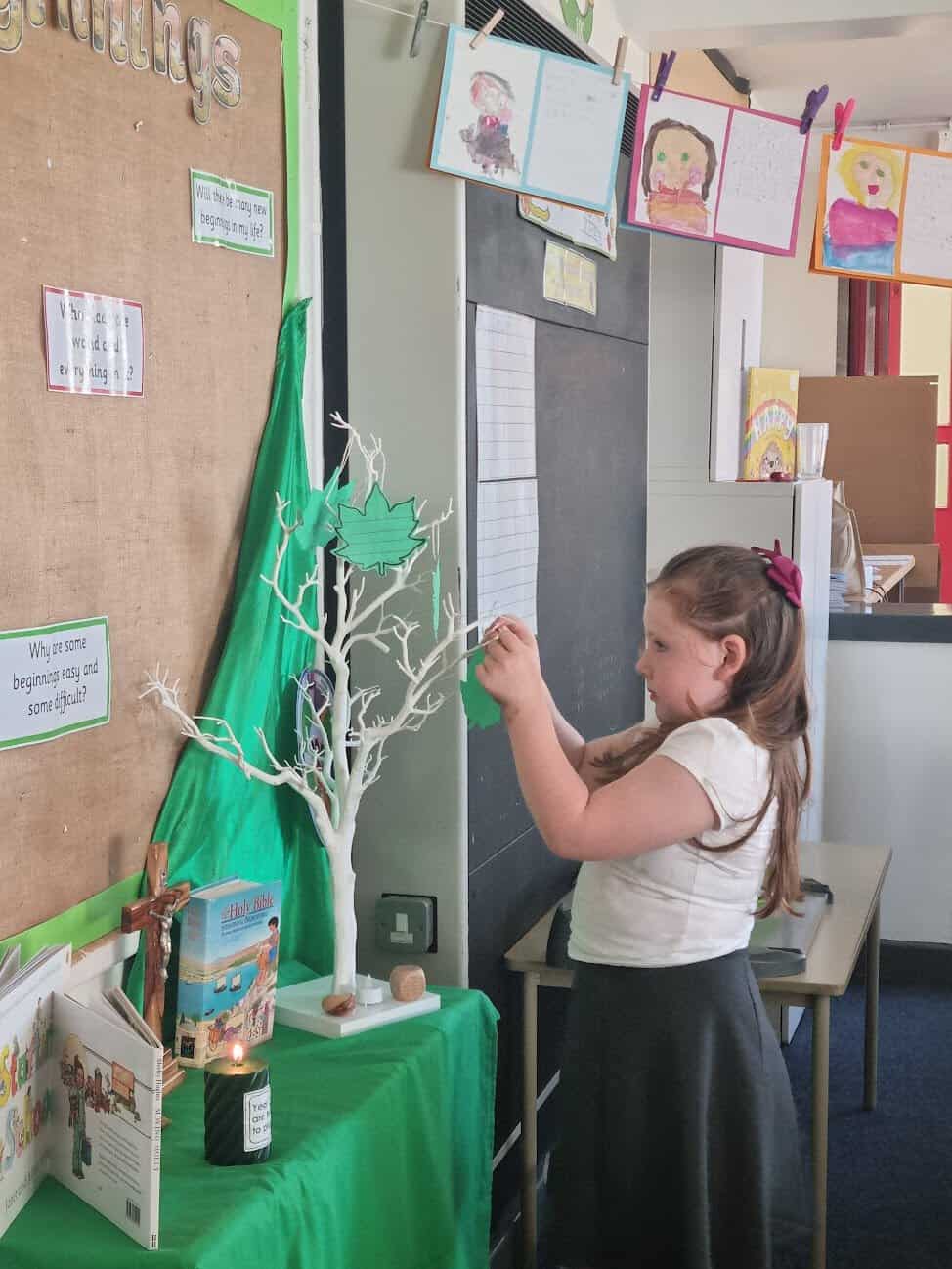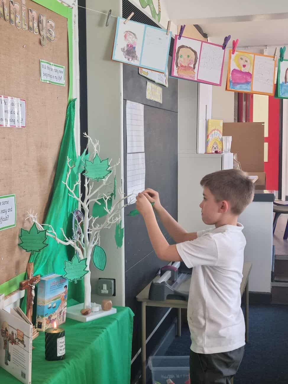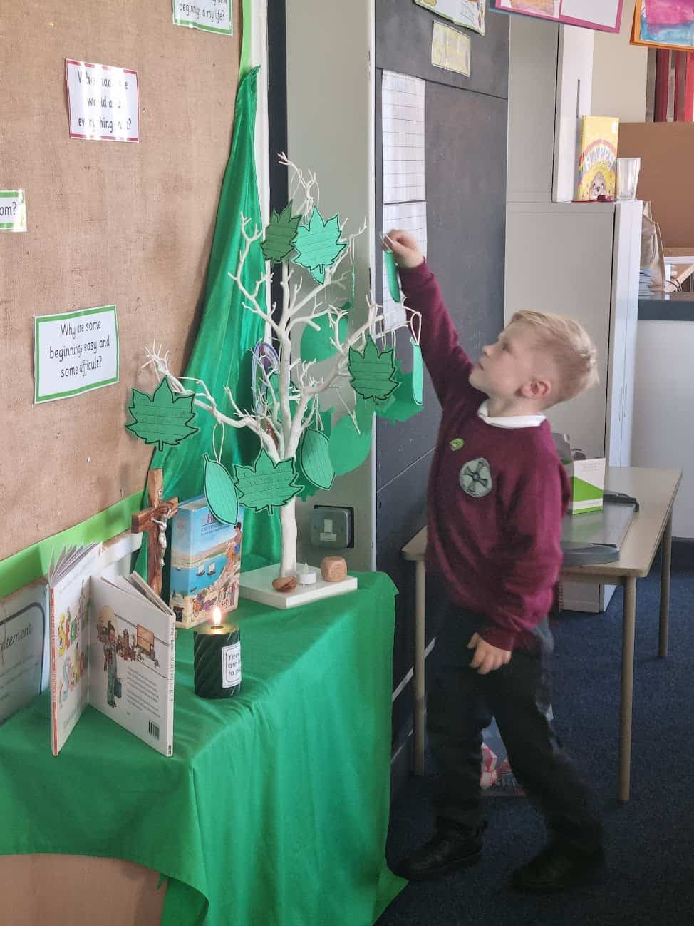 We then wrote on a leaf describing a new beginning. We gathered around our class display and had a quiet moment together reflecting on and appreciating how every beginning is an opportunity for a new start. We also thought about the many beginnings each new day offers.