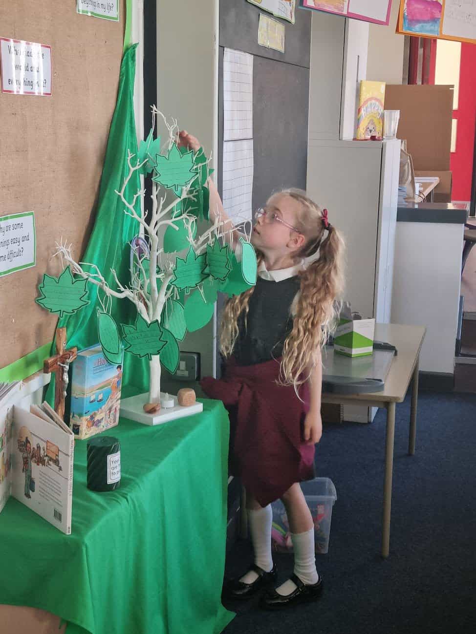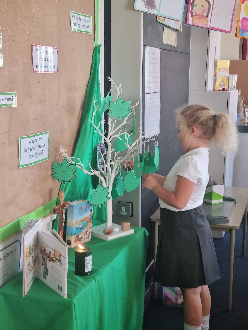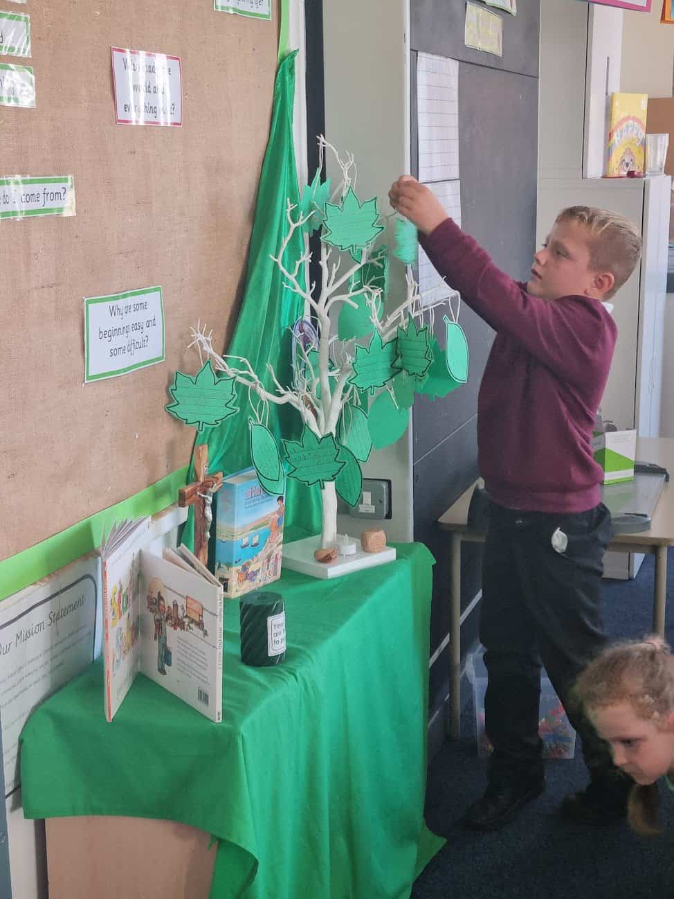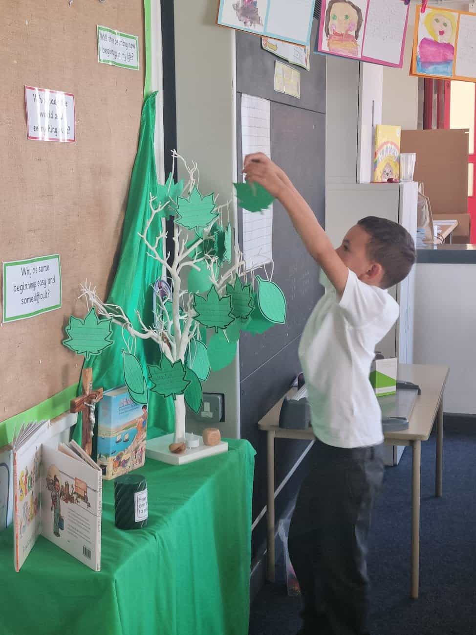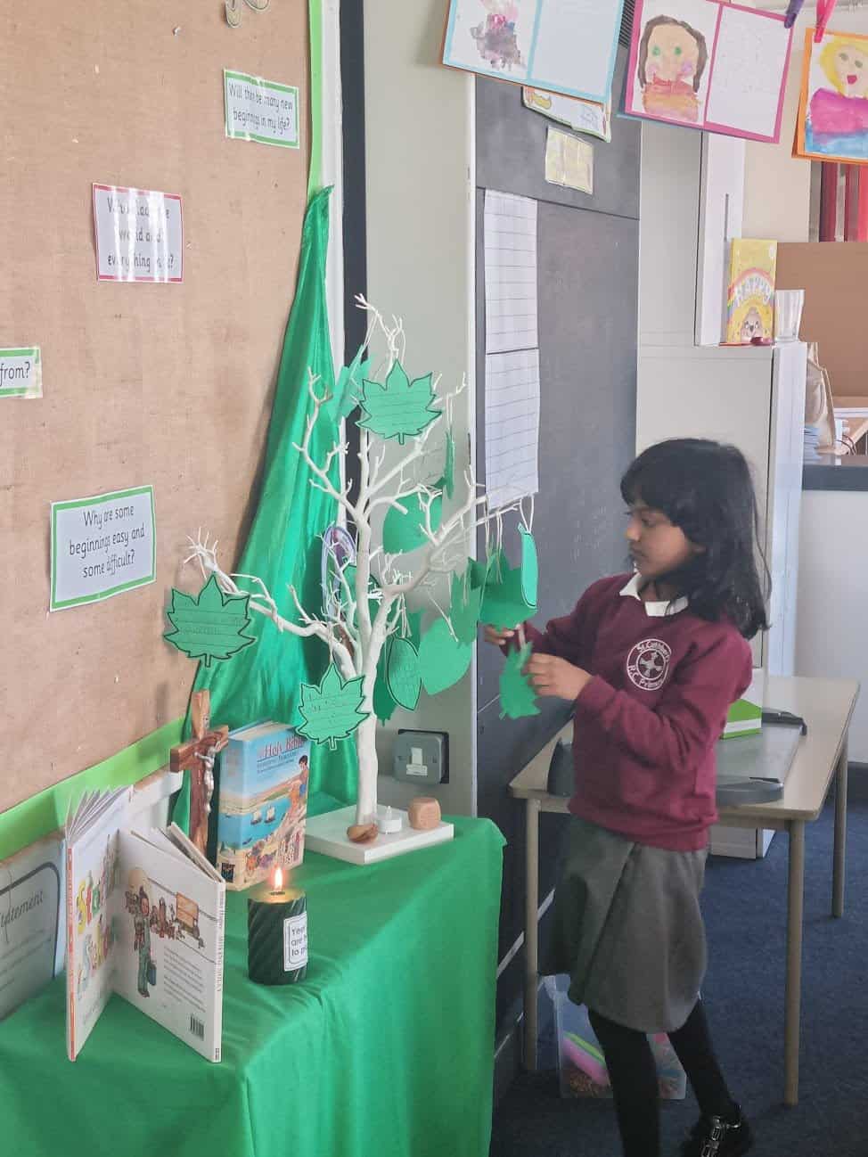 We then wrote on a leaf describing a new beginning. We gathered around our class display and had a quiet moment together reflecting on and appreciating how every beginning is an opportunity for a new start. We also thought about the many beginnings each new day offers.