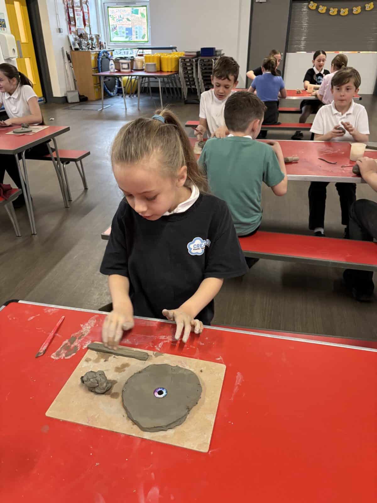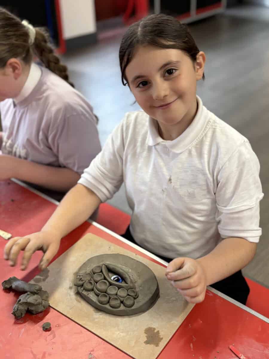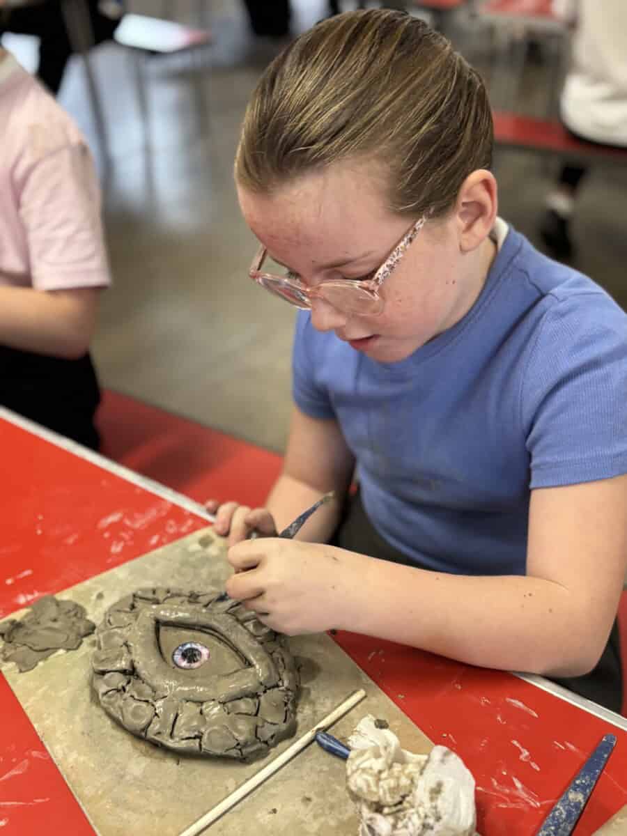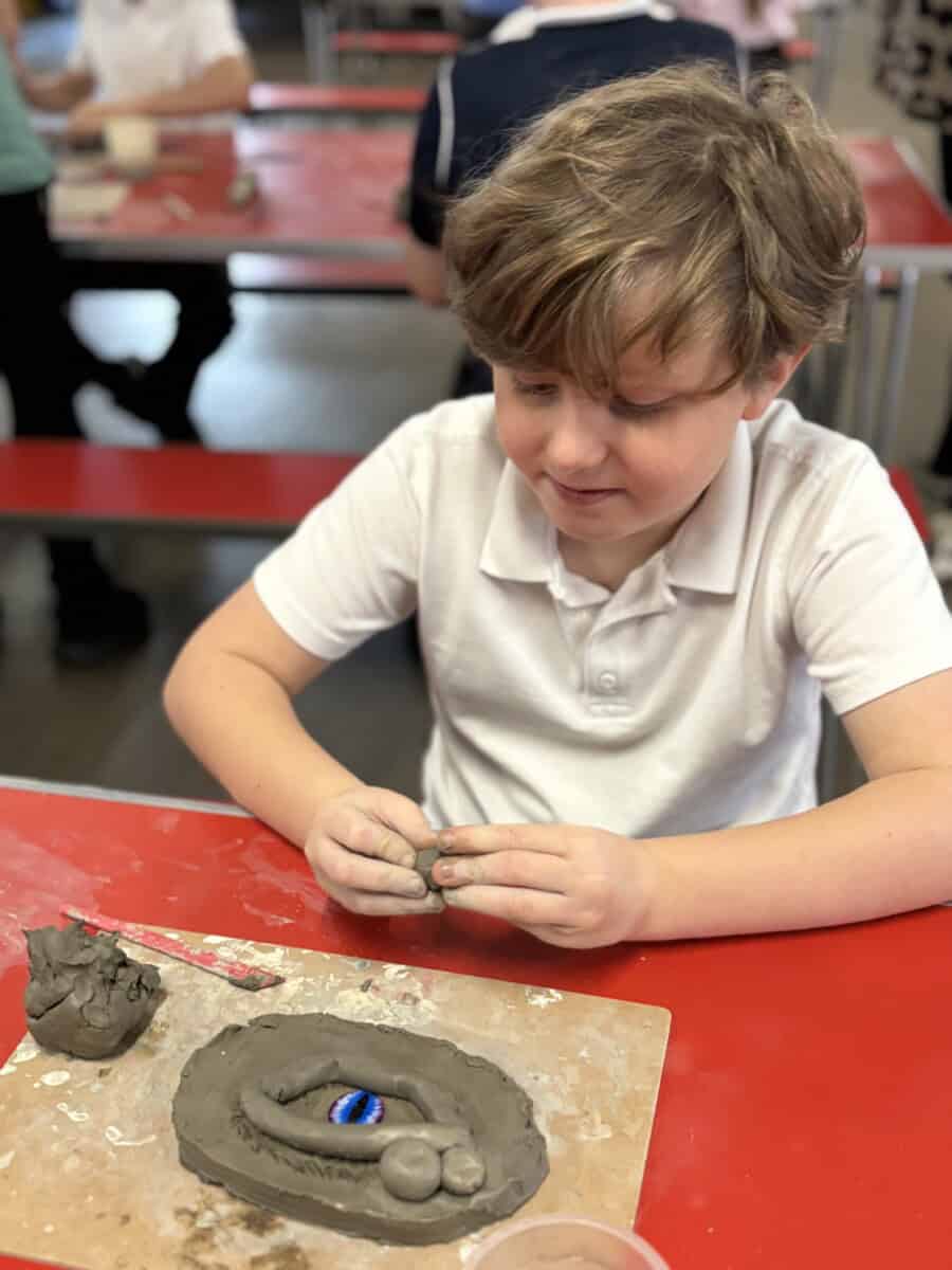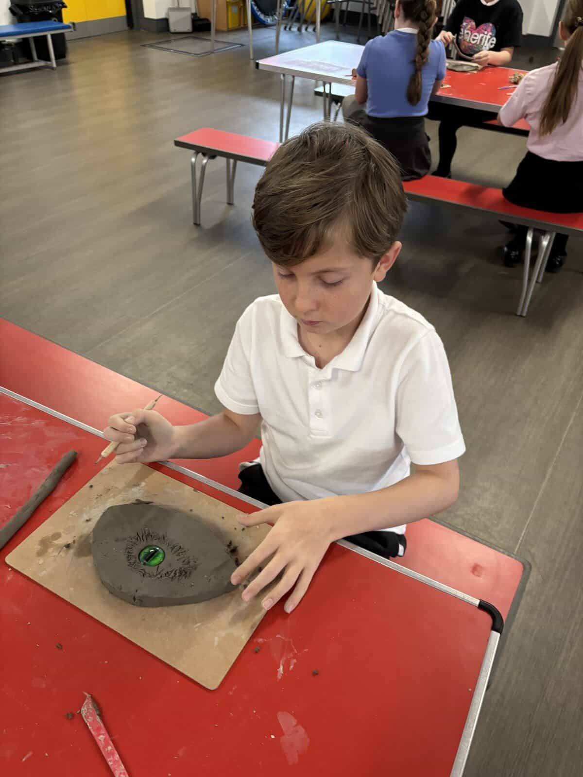 In art this term, Y5 have been looking at eyes. We completed some observational drawing of human and animal eyes and tried different media and techniques to add colour. For our final piece, we used clay to create dragon eyes. Using clay tools, we designed and made some scales and features to add to the eye shape. We got very messy and enjoyed trying new things with the clay.