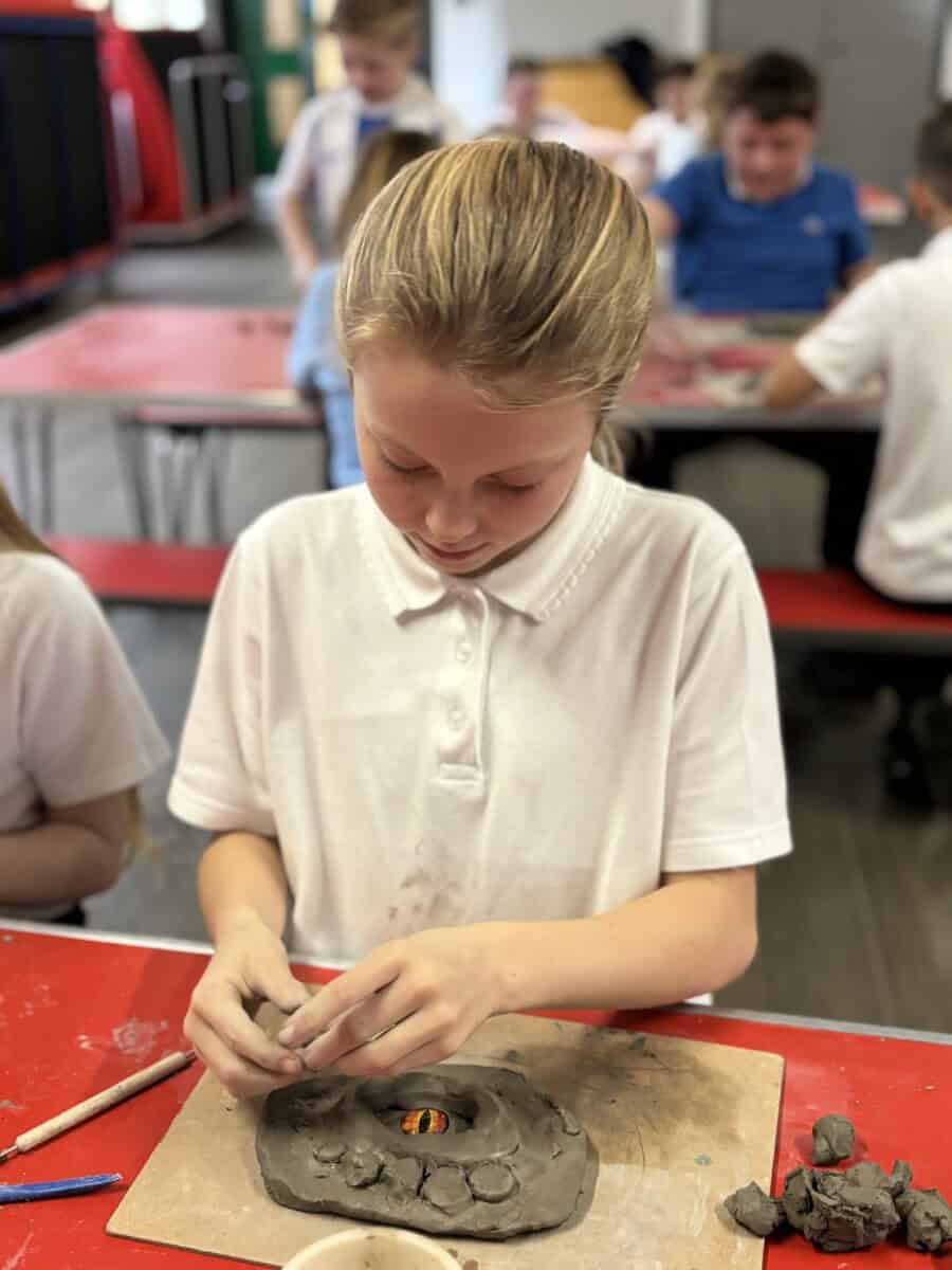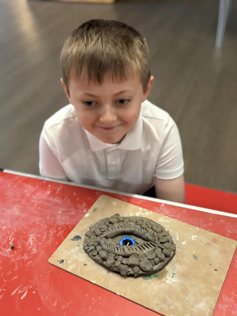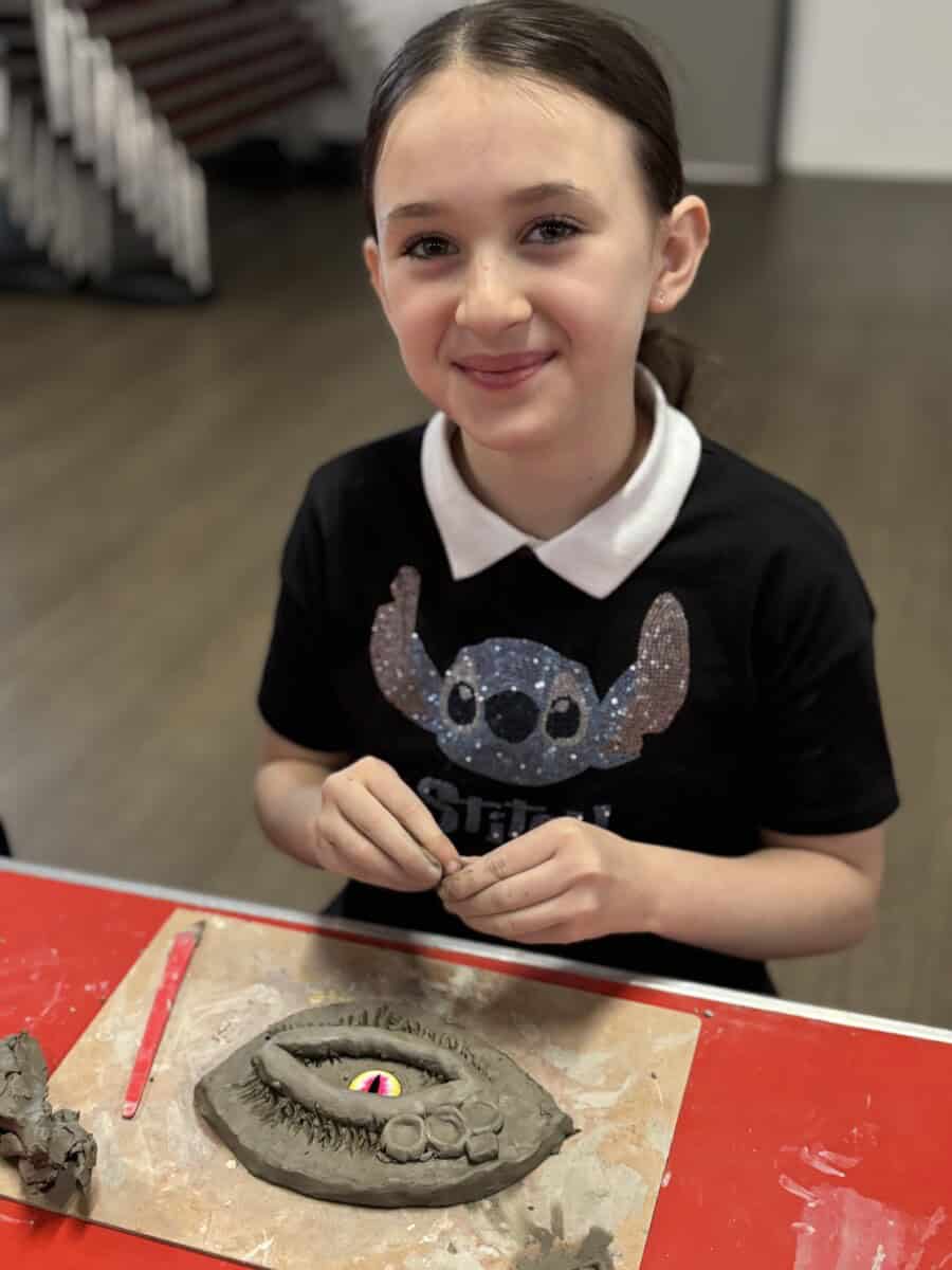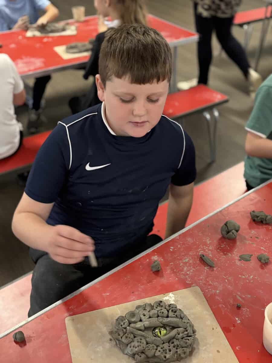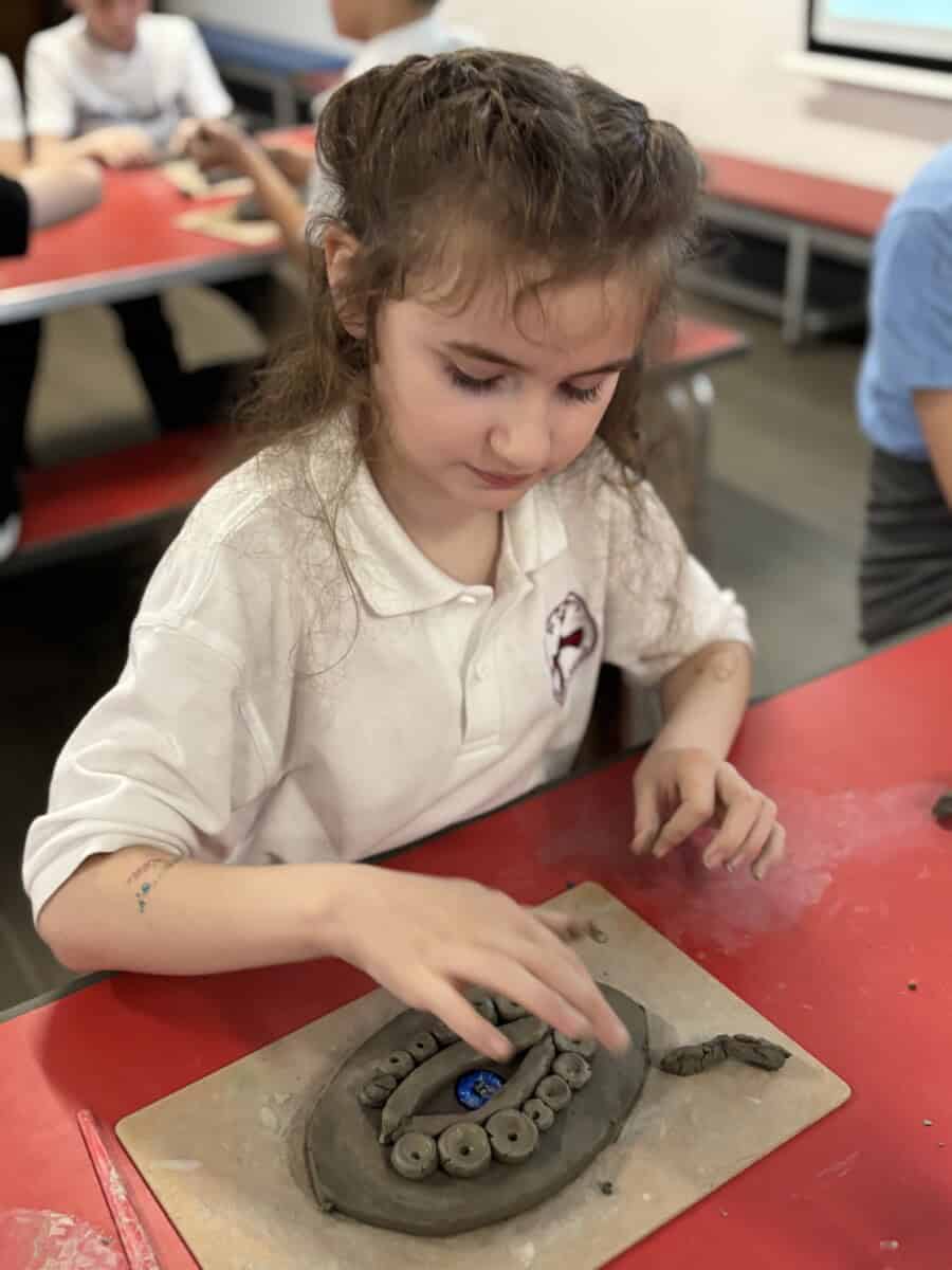 In art this term, Y5 have been looking at eyes. We completed some observational drawing of human and animal eyes and tried different media and techniques to add colour. For our final piece, we used clay to create dragon eyes. Using clay tools, we designed and made some scales and features to add to the eye shape. We got very messy and enjoyed trying new things with the clay.