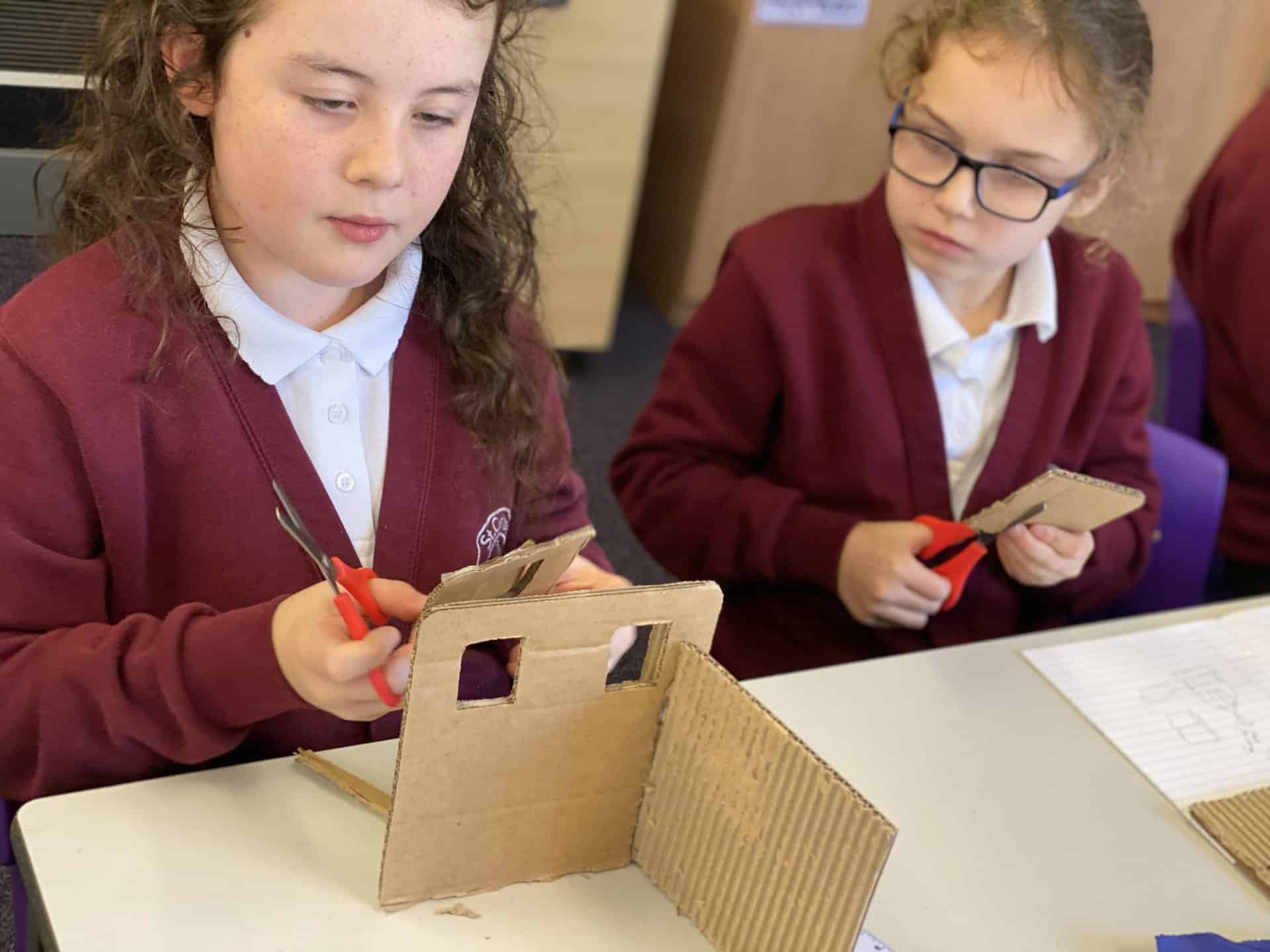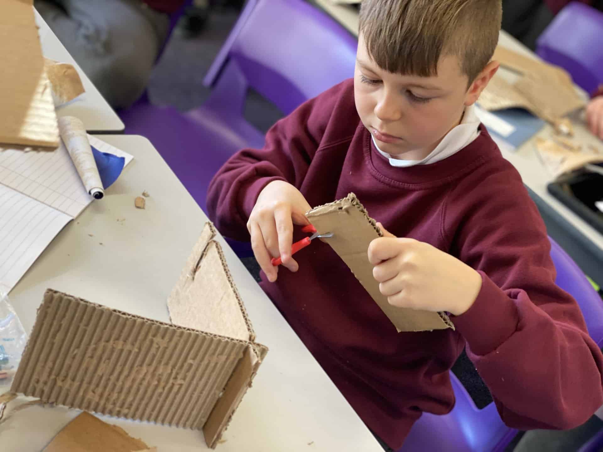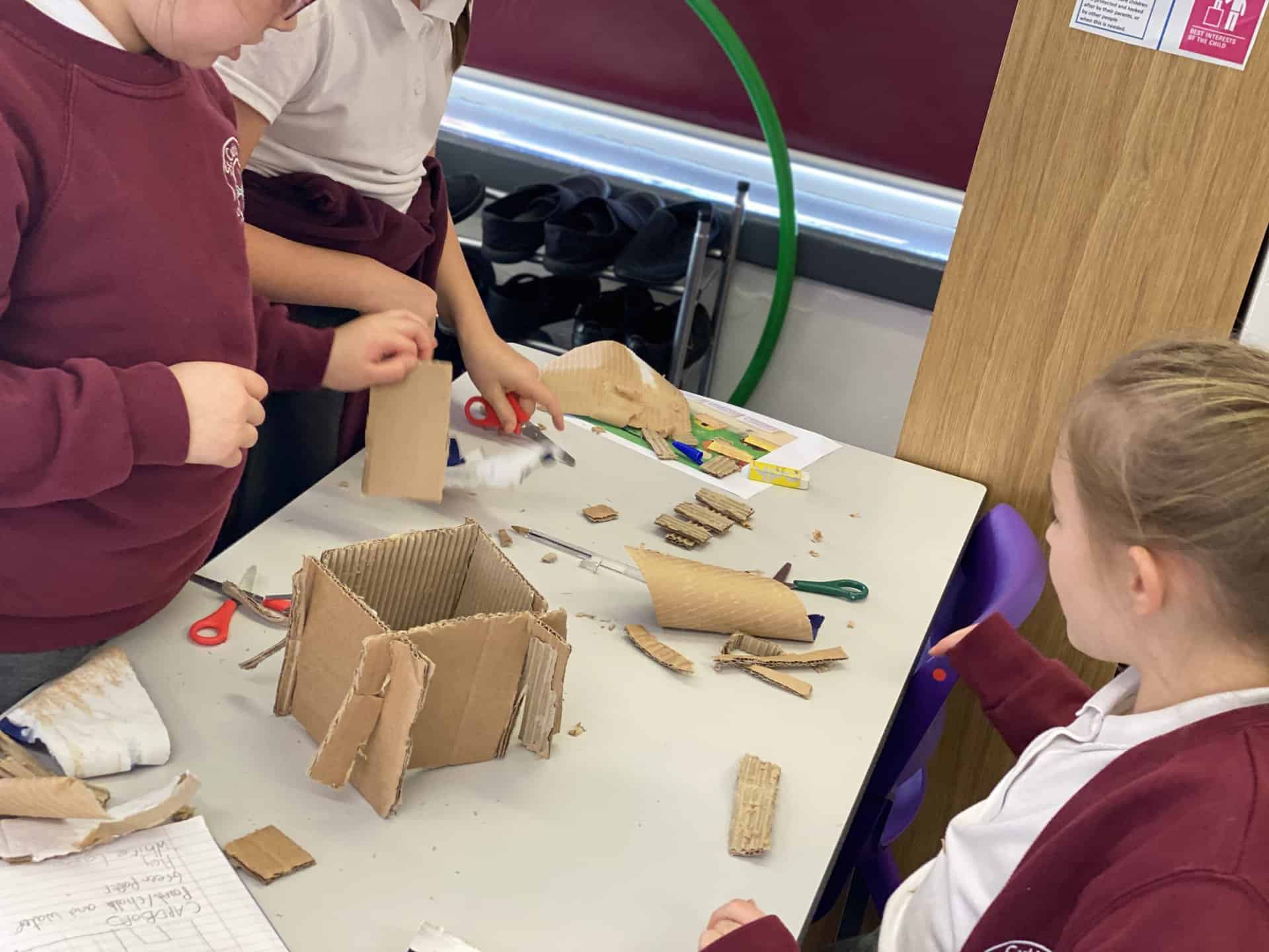 We thought about the things we would find in an Anglo Saxon village and worked in teams to make strong structures using triangle supports and slots to secure the card. A lovely (if slightly messy) afternoon! Great to see our home learners who are isolating also joining in.