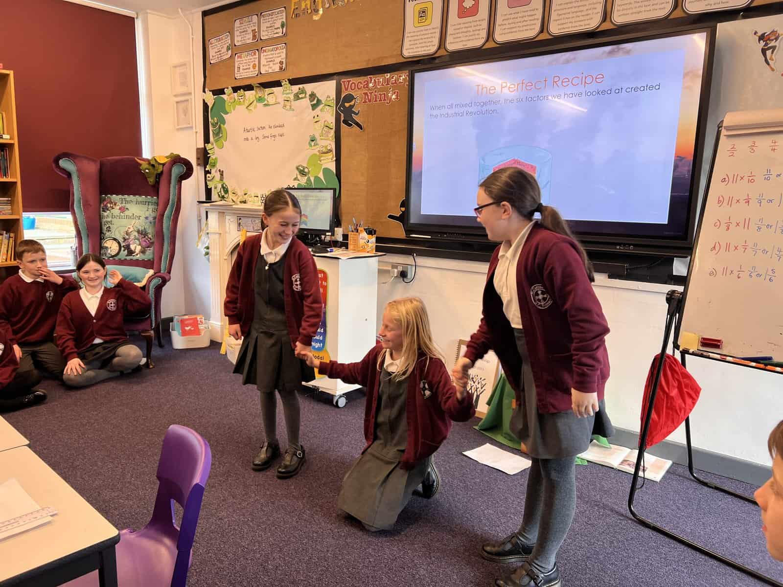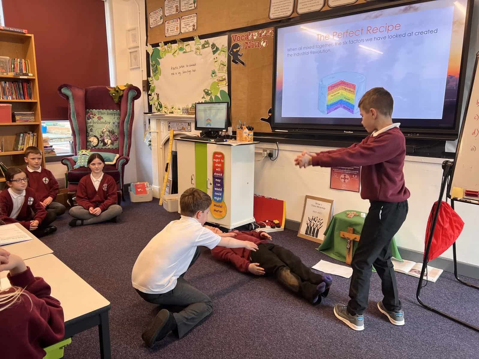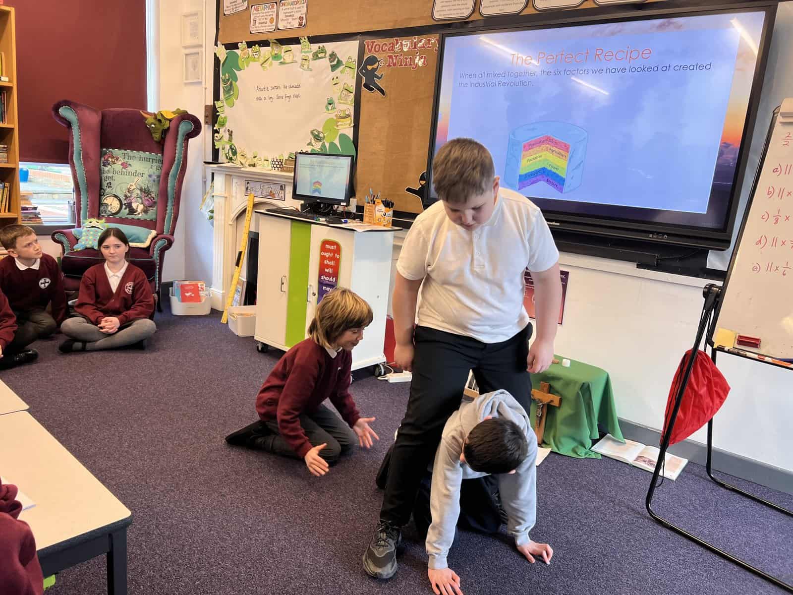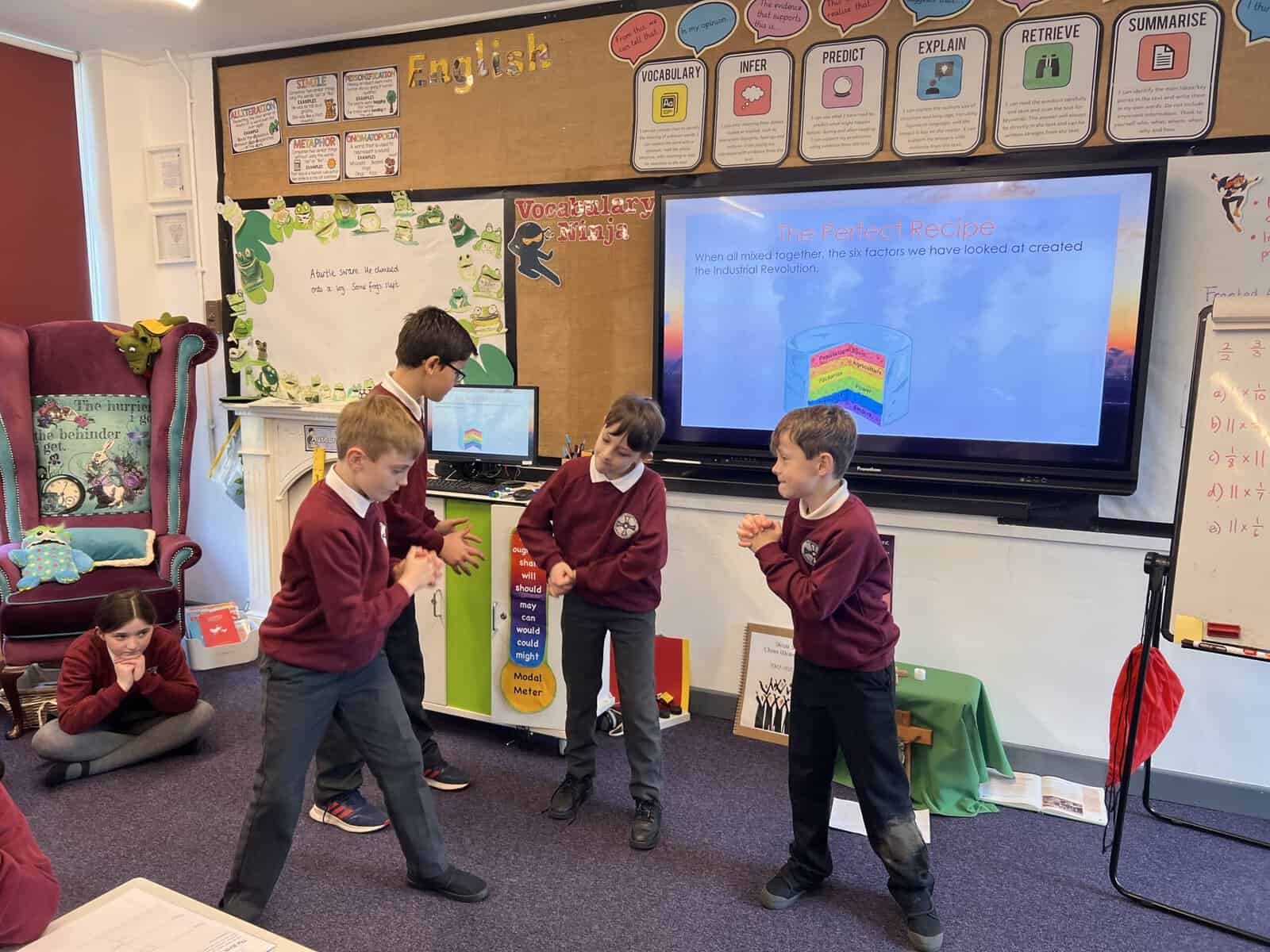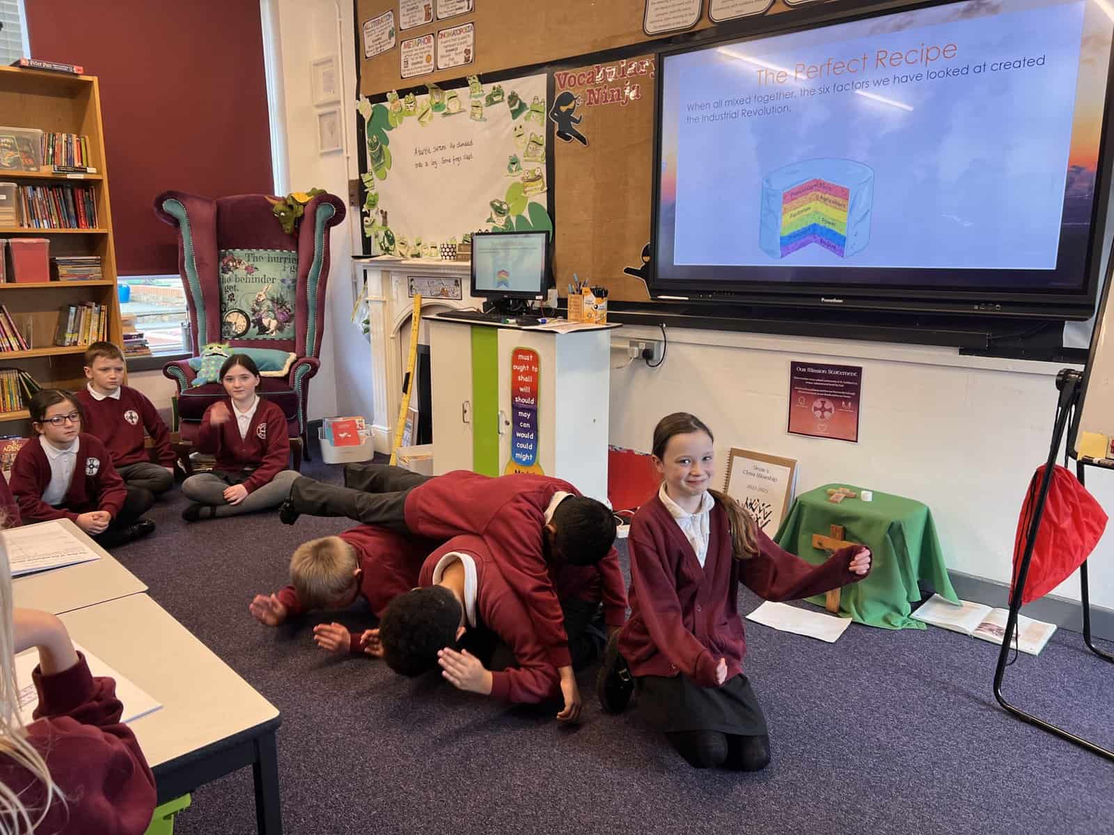 Our next history focus in Year 5 is ‘Changes in Britain after 1750’, especially changes in Seaham. Our first lesson used our summarising skills, which we practise in English lessons. Each group was given an important change that happened during the Industrial Revolution and we had to create a mime that summarised the important pieces of information for our friends in class to guess. These changes were: Population, Agriculture, Factories, Power, Transport and Empire. Can you guess which ones we are miming? Acting out the key changes helped us understand and remember so we were then more confident when writing short summaries.