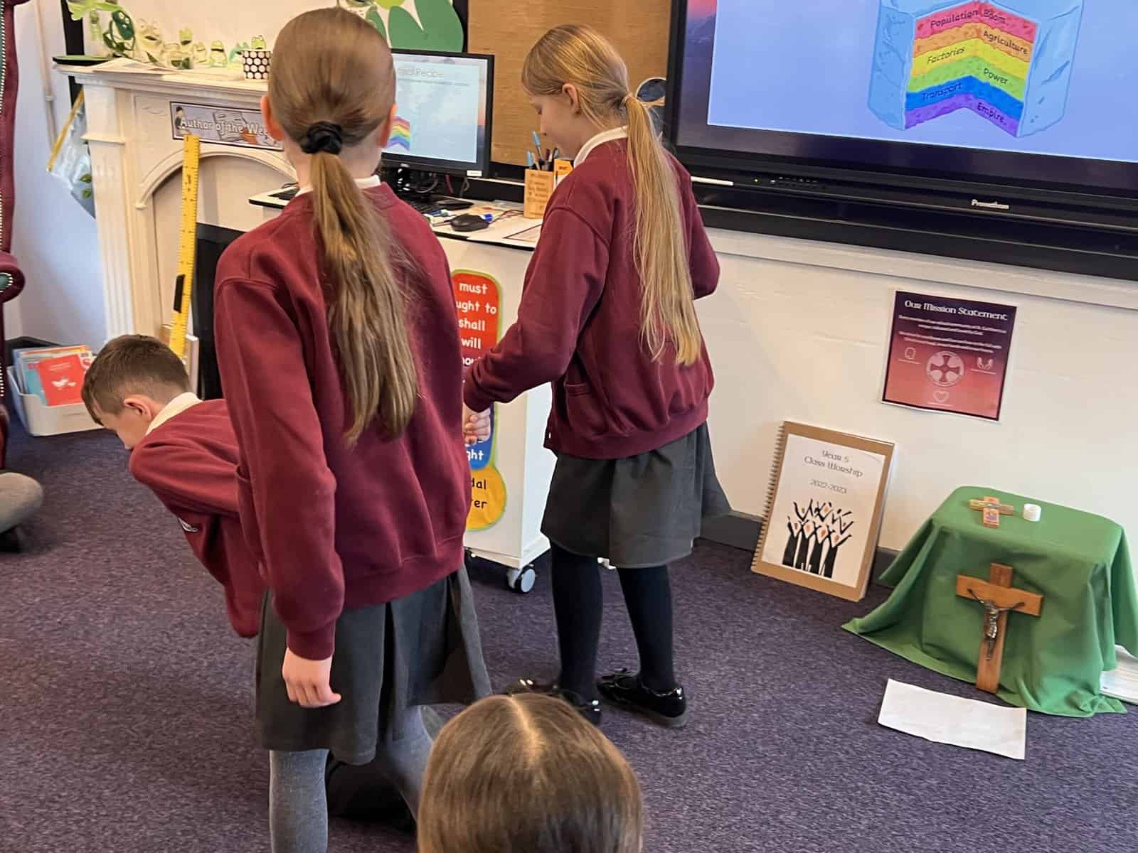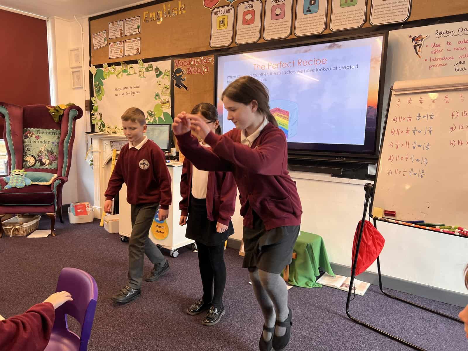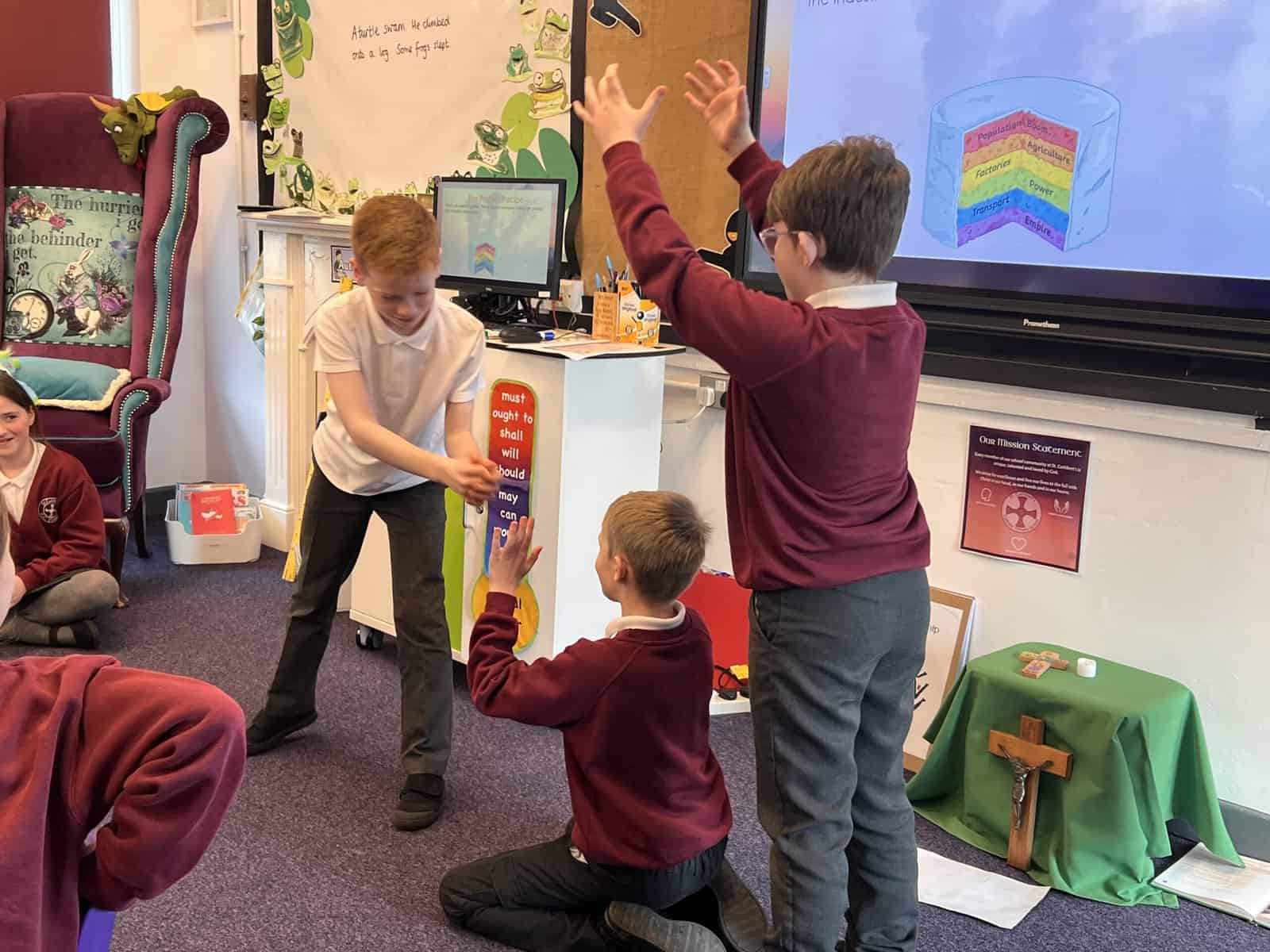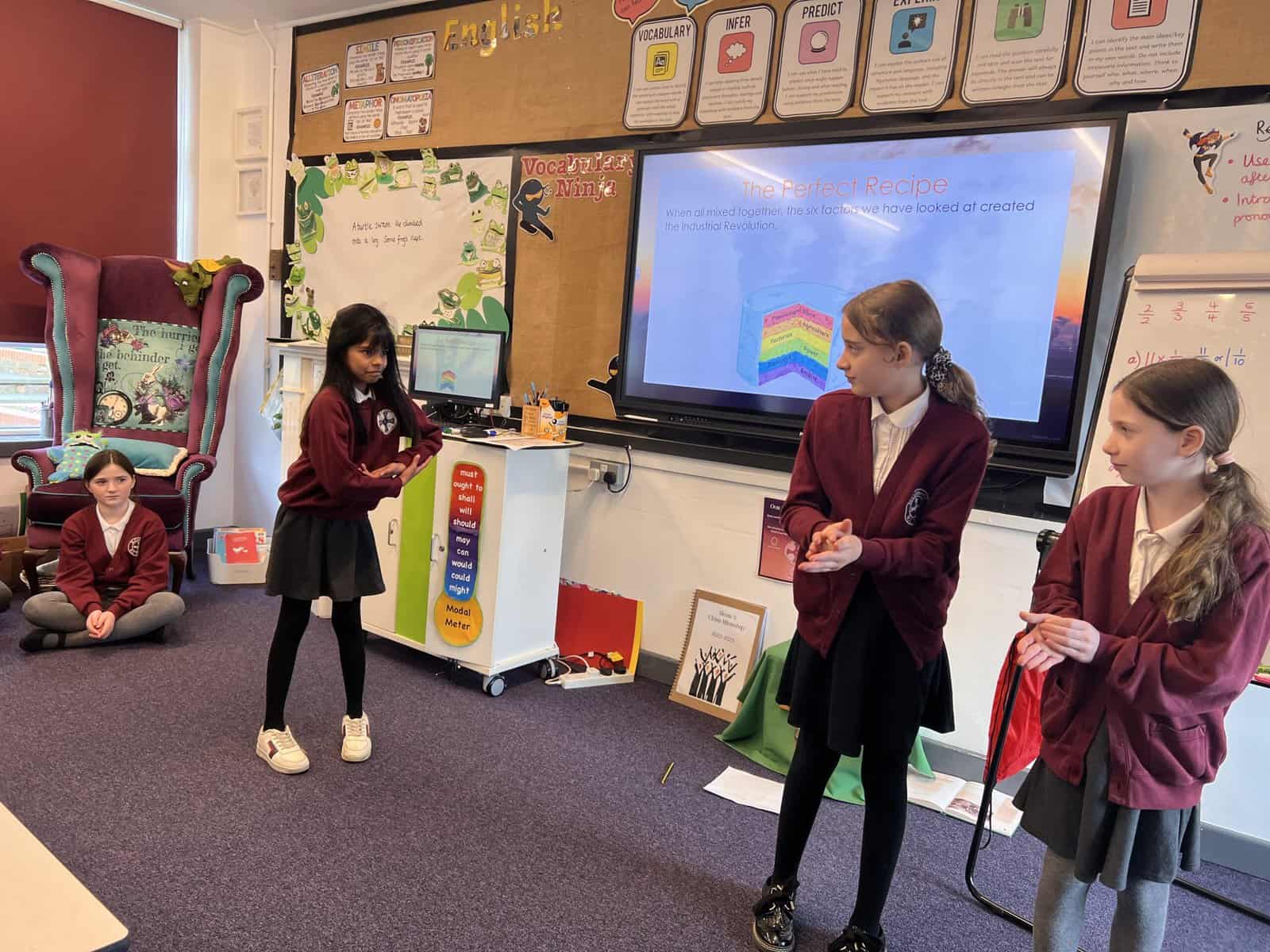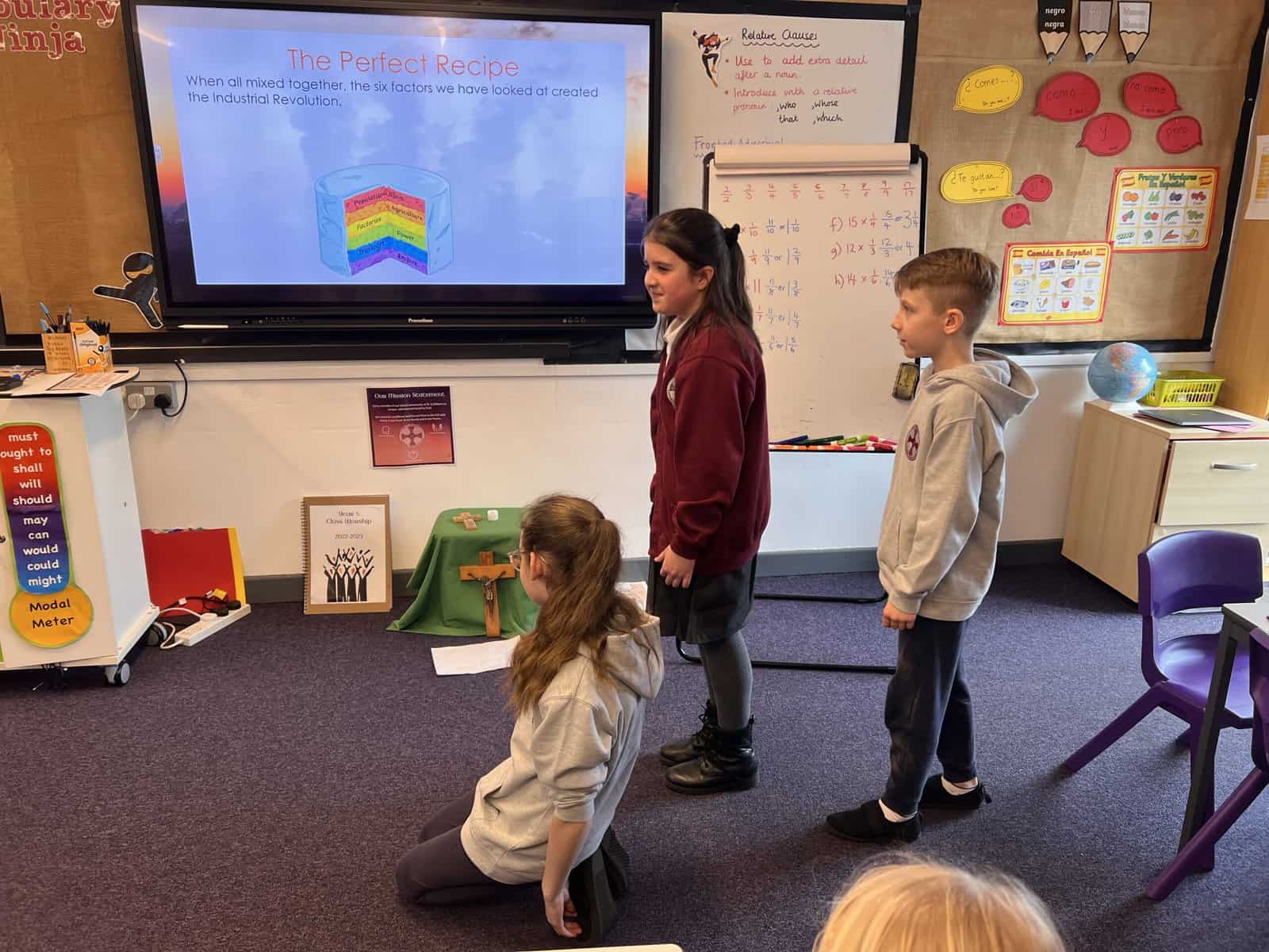 Our next history focus in Year 5 is ‘Changes in Britain after 1750’, especially changes in Seaham. Our first lesson used our summarising skills, which we practise in English lessons. Each group was given an important change that happened during the Industrial Revolution and we had to create a mime that summarised the important pieces of information for our friends in class to guess. These changes were: Population, Agriculture, Factories, Power, Transport and Empire. Can you guess which ones we are miming? Acting out the key changes helped us understand and remember so we were then more confident when writing short summaries.